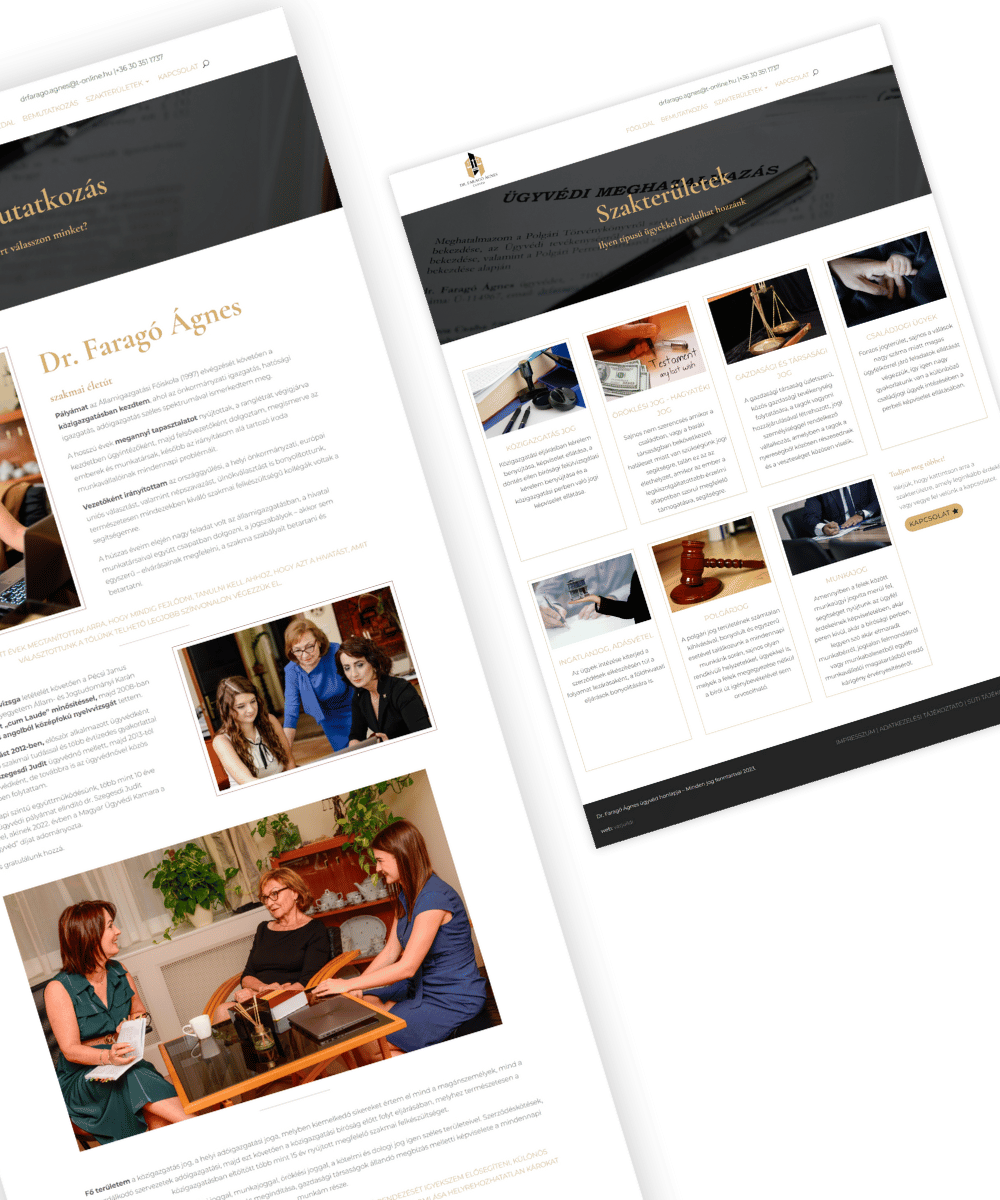 Foglalkozom családjoggal, társasági joggal, munkajoggal, öröklési joggal, a kötelmi és dologi jog igen széles területeivel. Szerződéskötések, adásvételek, telekalakítások, felszámolási eljárás megindítása, gazdasági társaságok állandó megbízás melletti képviselete a mindennapi munkám része.” – ezt meséli Ágnes ügyvédnő.